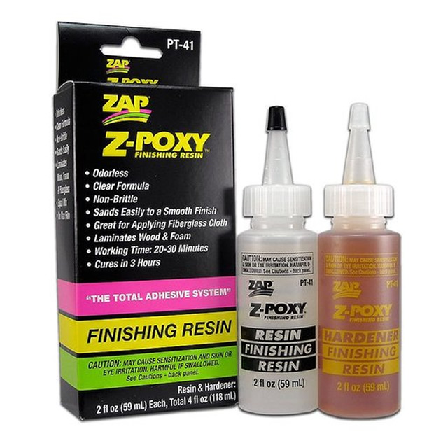Z-Poxy Finishing Resin is a premium lightweight two part epoxy laminating / finishing type resin. Use for glassing the centre-section of a wing or the entire aeroplane. Great for sealing model boat hulls, inside and out. Use to seal all engine and fuel tank areas. Great for sheeting foam wing panels, too. It will bond to itself and does not get brittle with age. This long cure formula offers easy application, sands easily for a smooth finish and is compatible with many polyester resins.